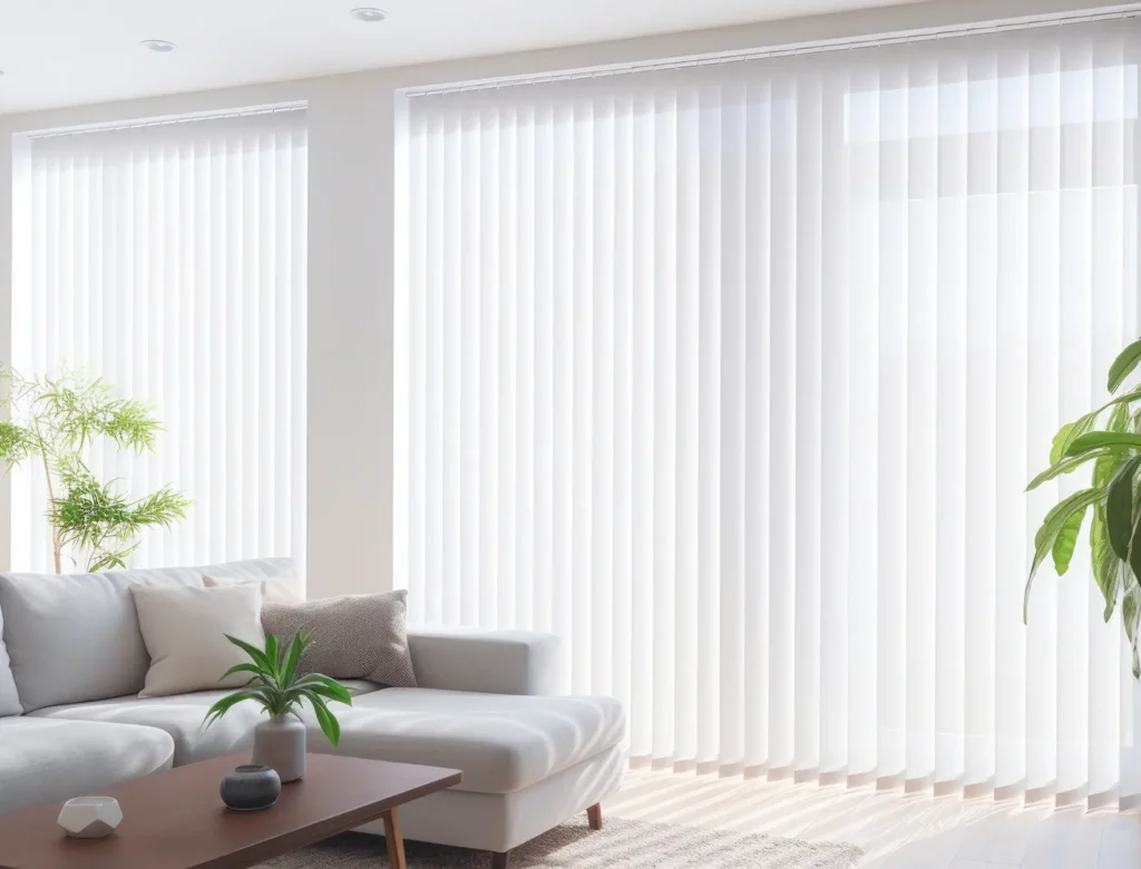 Vertical blinds offer rhythm and structure, ideal for wide expanses of glass, providing smooth light control and a sleek linear look. Durable and practical, they suit both residential and commercial applications.